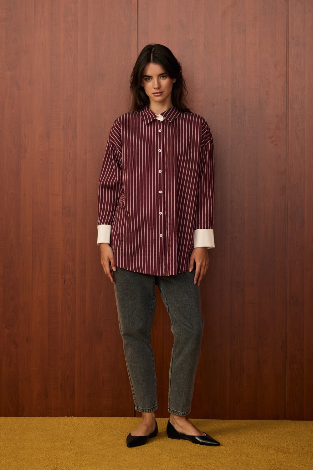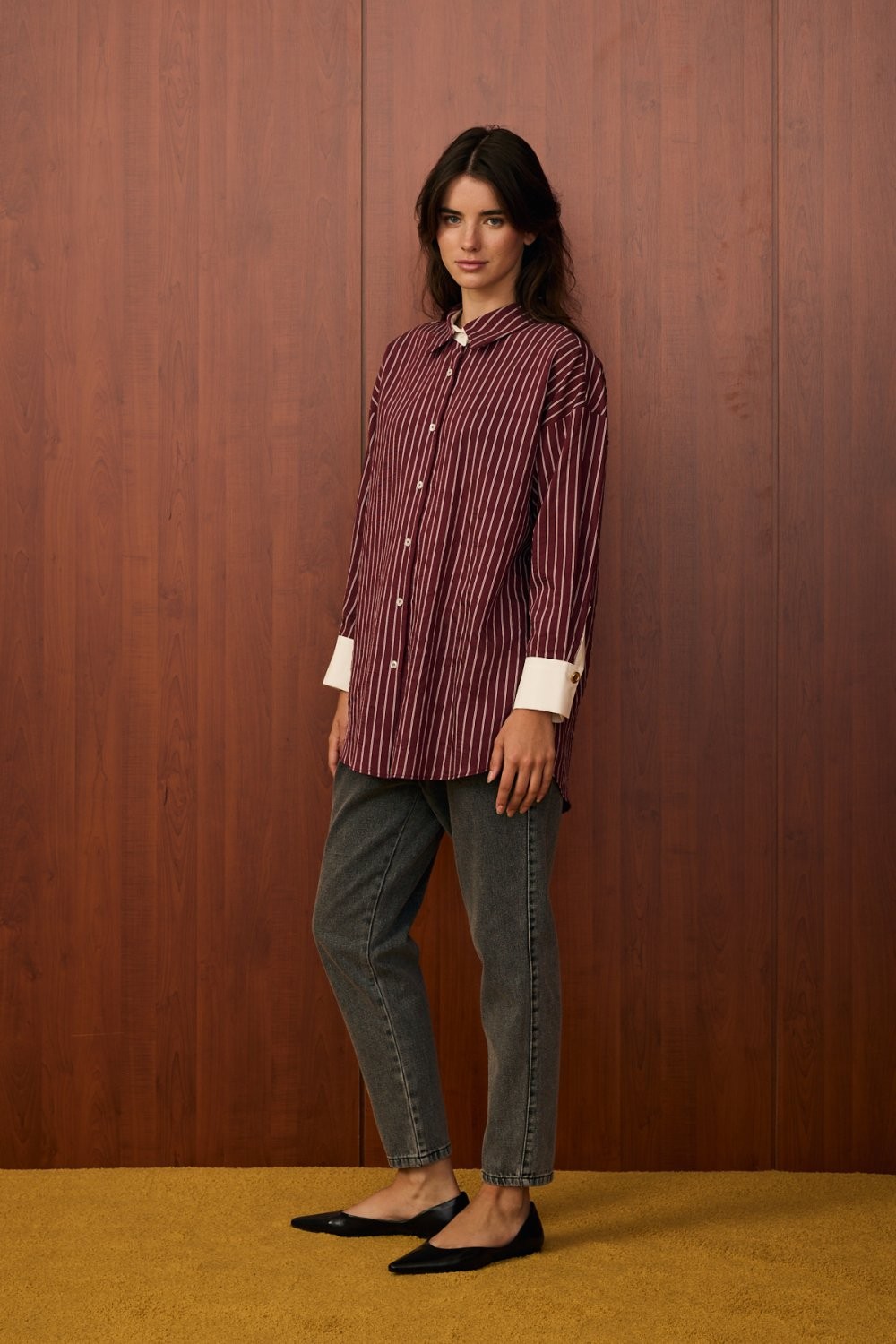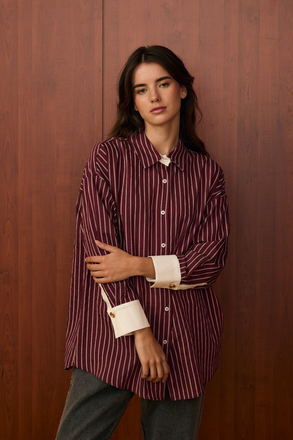 Model Detayı: Çizgili, oversize kesim, uzun kollu gömlek. Düğmeli tasarımı ve kontrast manşet detayı ile modern bir görünüm sunar.