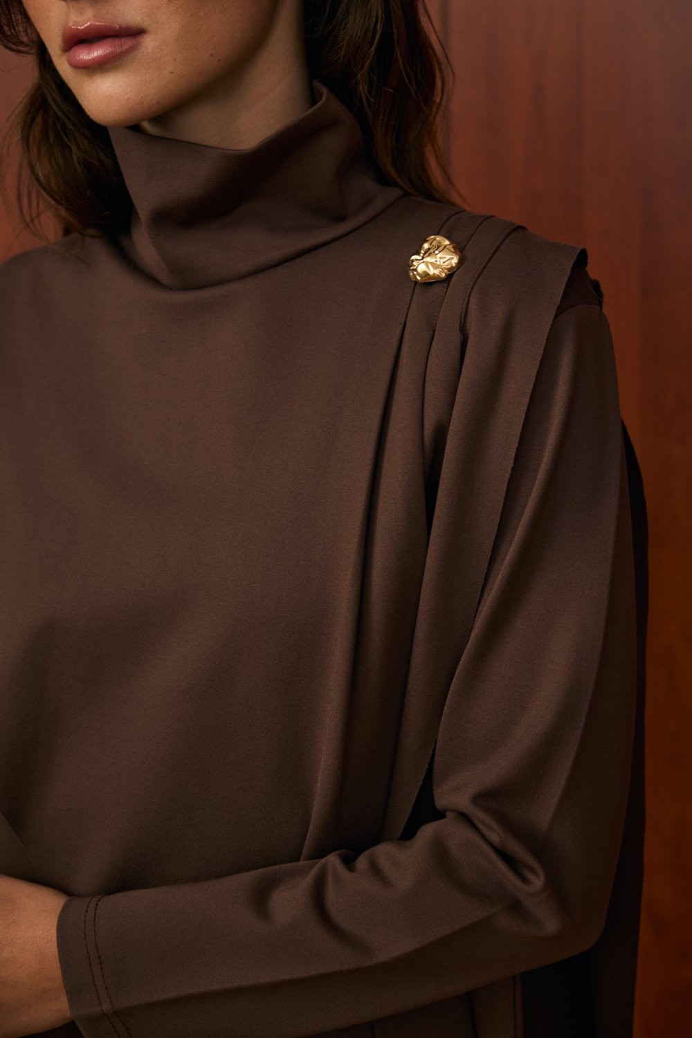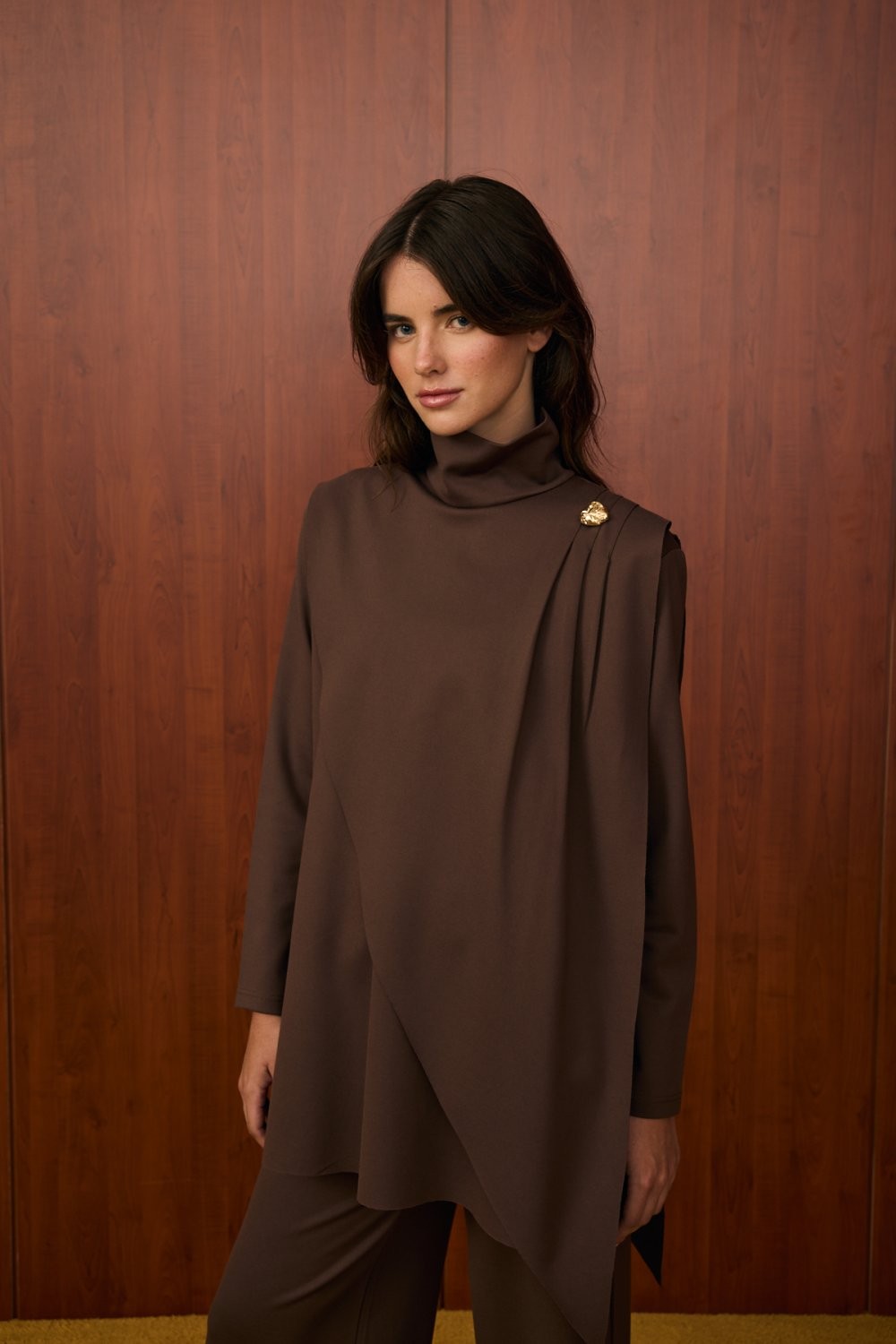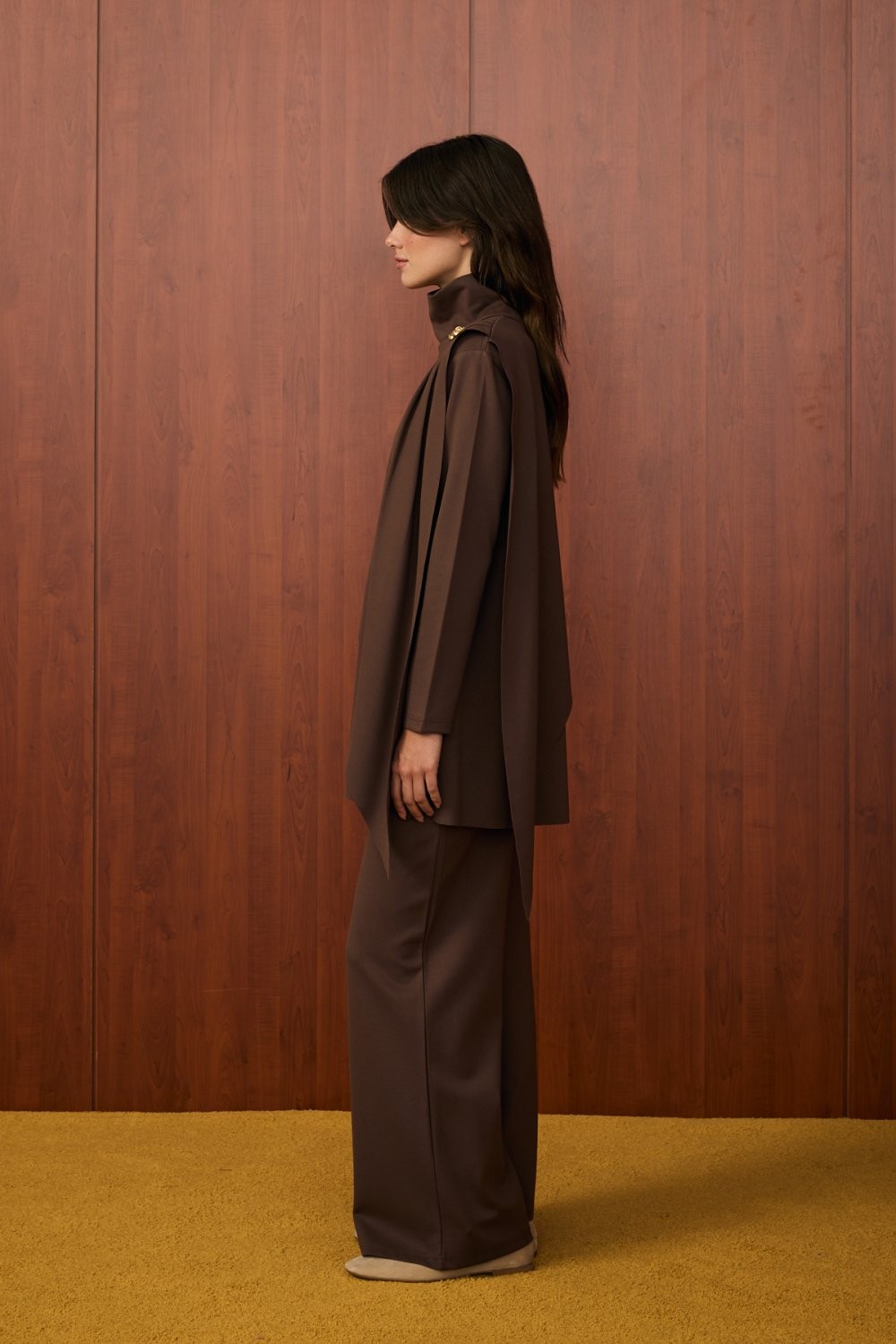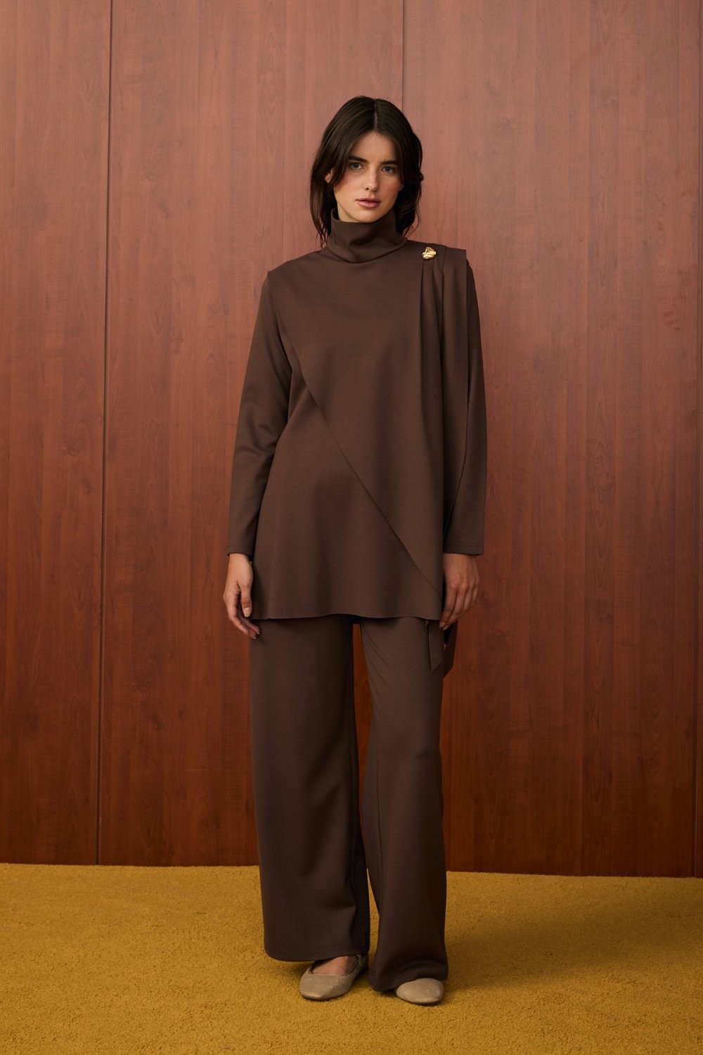 • Üst parça asimetrik kesime sahip olup, omuz kısmında dekoratif metal düğme detayı bulunmaktadır.