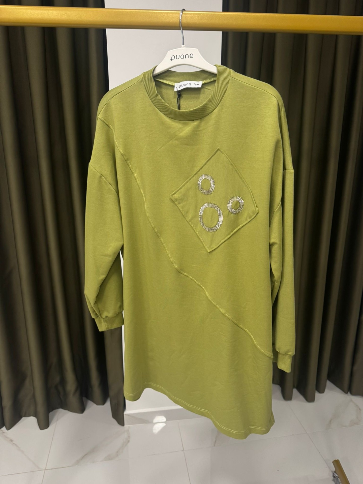 Zarif aplikeler ve detaylı işlemelerle modern bir şıklık sunan bu tunik, özgün tasarımıyla öne çıkar. Konforlu kesimi ve hafif dokusuyla günlük kombinlerde hem şık hem de rahat bir kullanım sağlar.