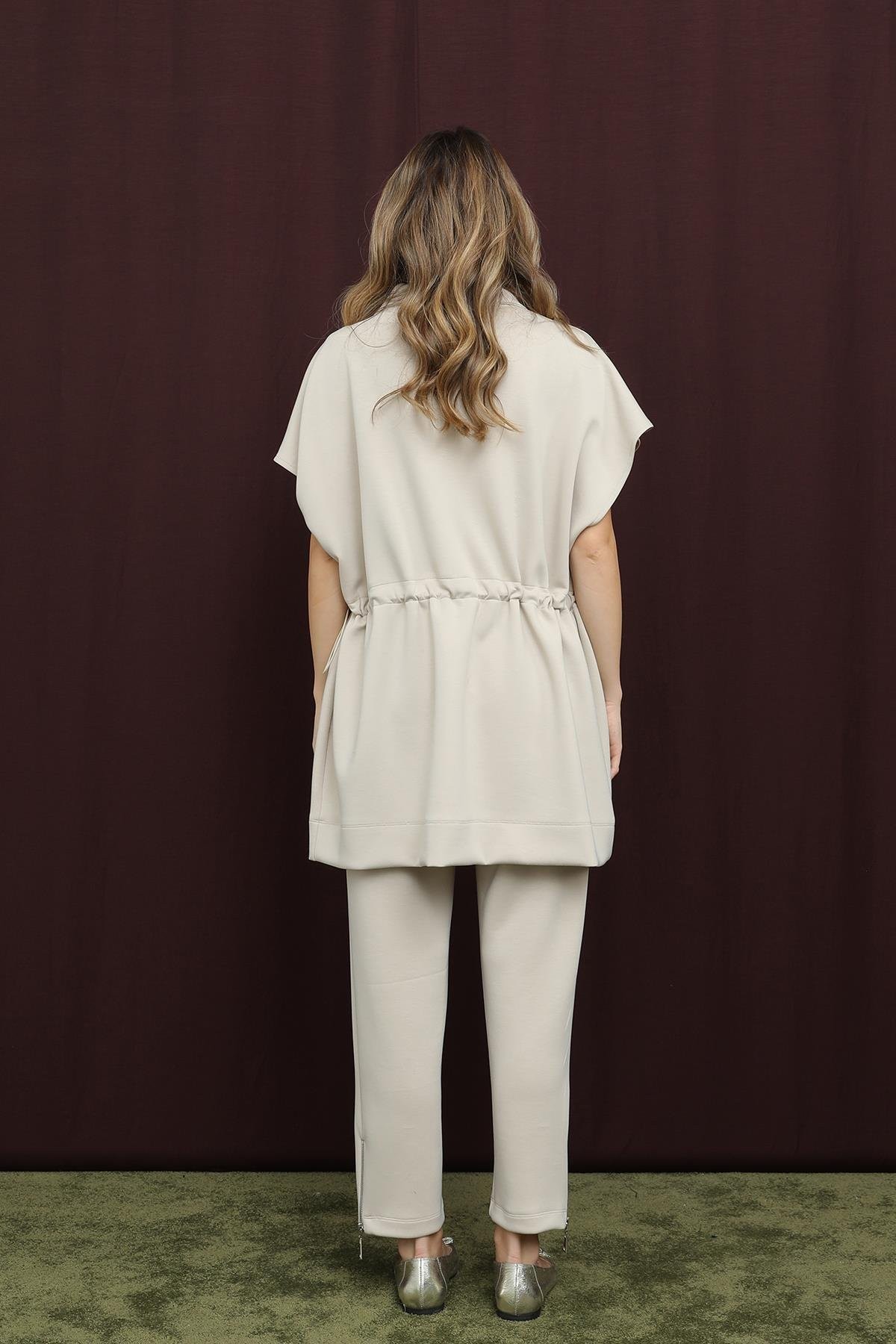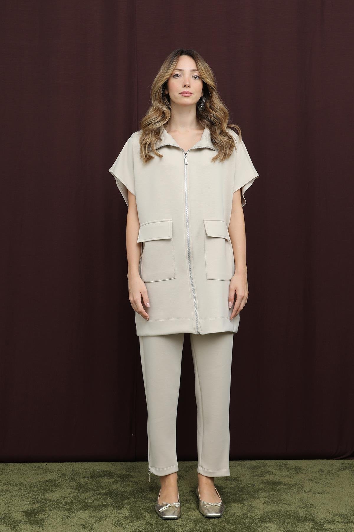 Yakası şerit detaylarıyla modern ve şık bir görünüm sunan bu pantolonlu takım, rahat kesimiyle gün boyu konfor sağlar. Hem şıklığınızı