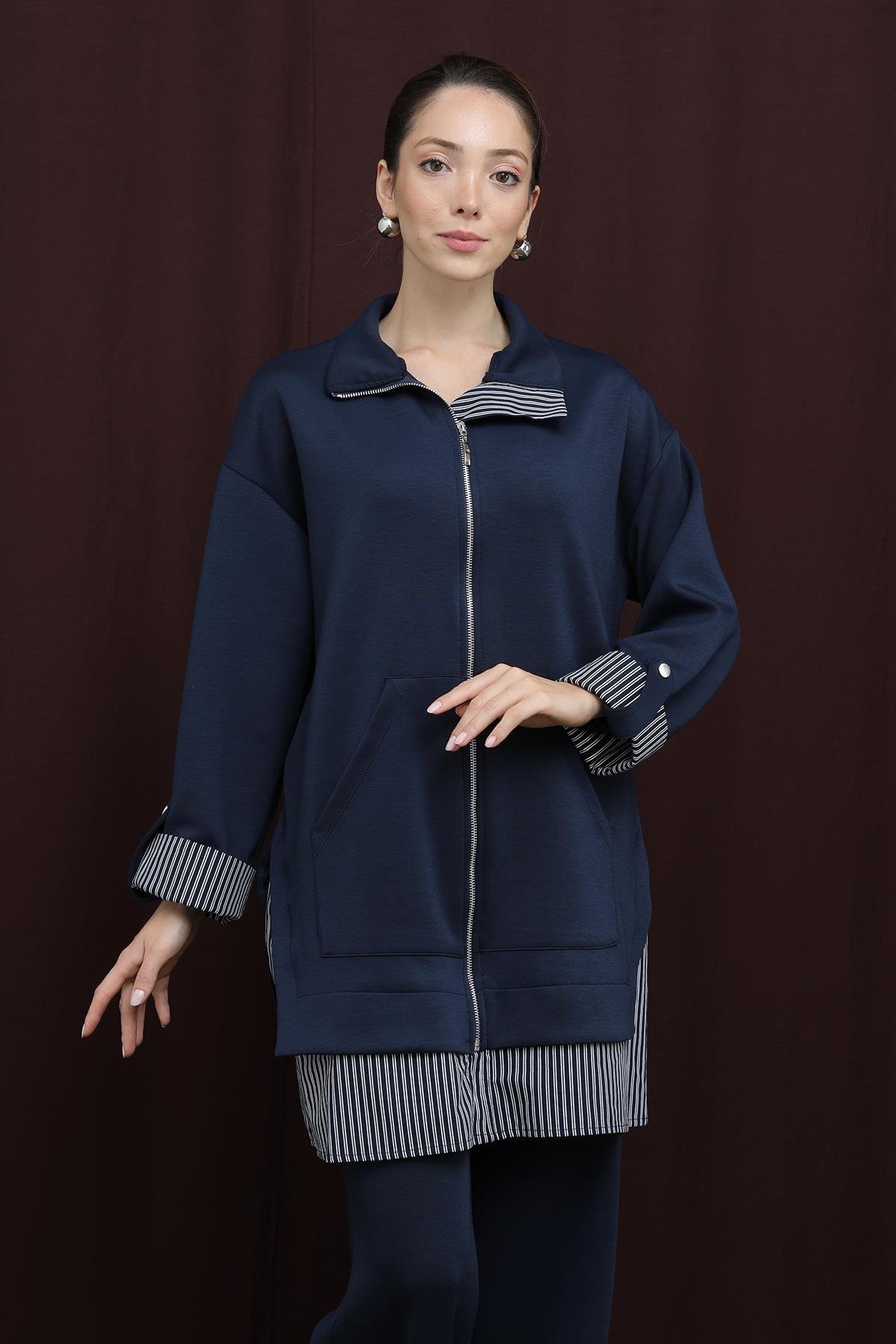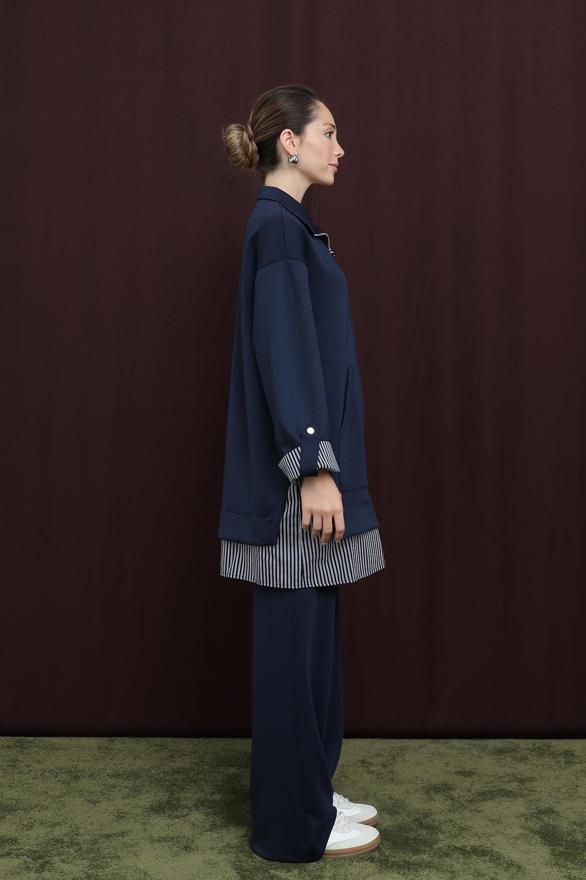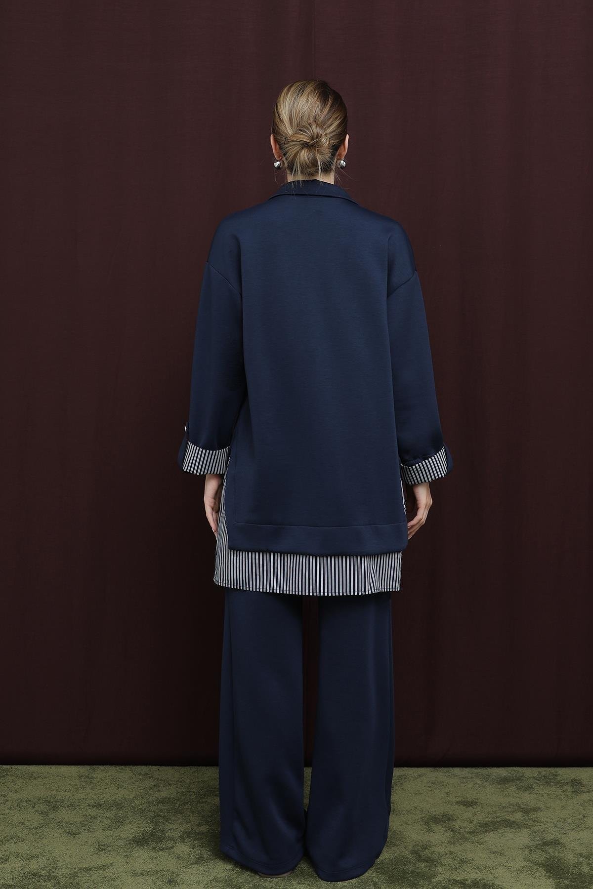 Yakası şerit detaylarıyla modern ve şık bir görünüm sunan bu pantolonlu takım, rahat kesimiyle gün boyu konfor sağlar. Hem şıklığınızı