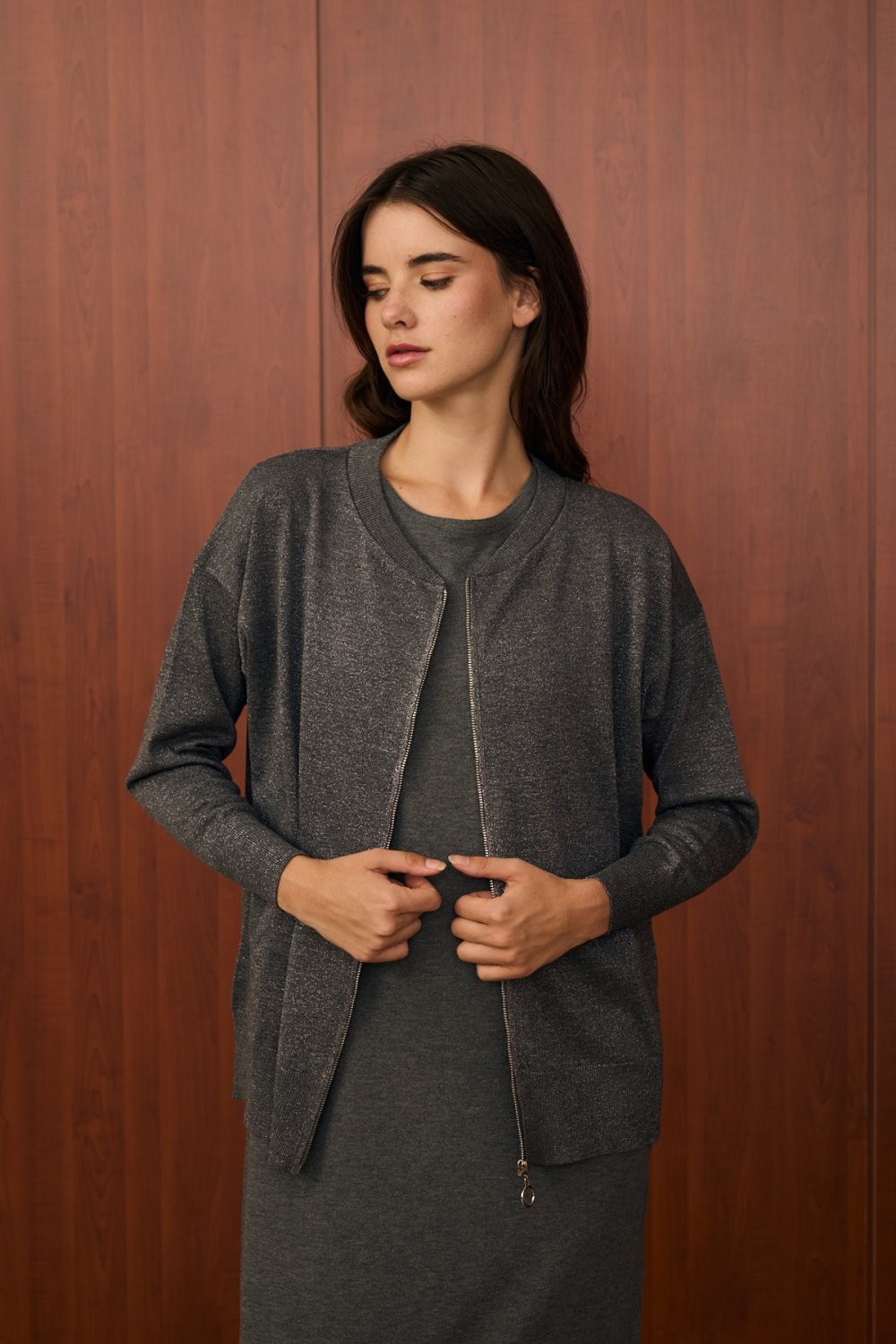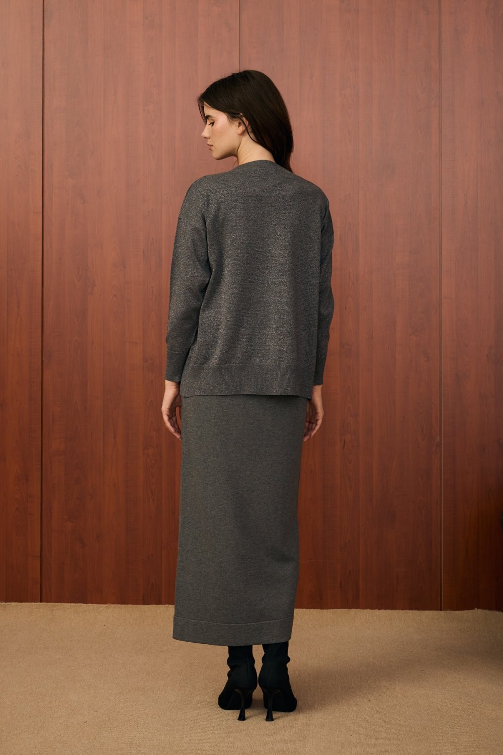 Simli yapısıyla zarafeti ön plana çıkaran bu takım, sade şıklık arayanlar için ideal bir seçenektir. Hafif parlak dokusu ve düz kesimiyle gündüzden geceye kullanım kolaylığı sunar. Ceket kısmında yer alan metalik fermuar detayları, modern bir dokunuş kazandırır.