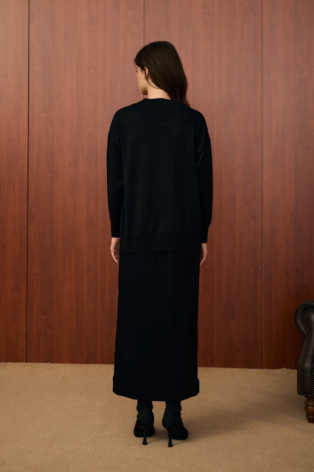 Simli yapısıyla zarafeti ön plana çıkaran bu takım, sade şıklık arayanlar için ideal bir seçenektir. Hafif parlak dokusu ve düz kesimiyle gündüzden geceye kullanım kolaylığı sunar. Ceket kısmında yer alan metalik fermuar detayları, modern bir dokunuş kazandırır.