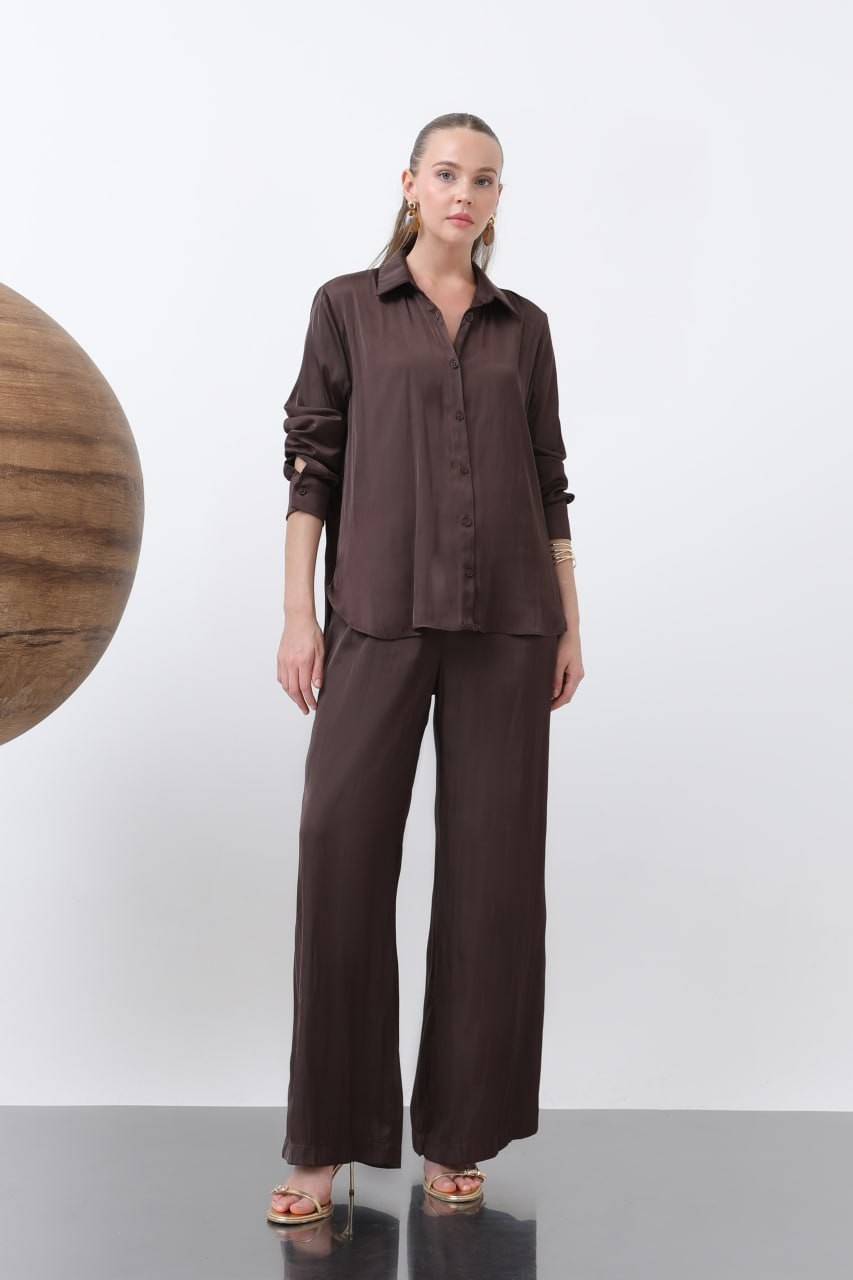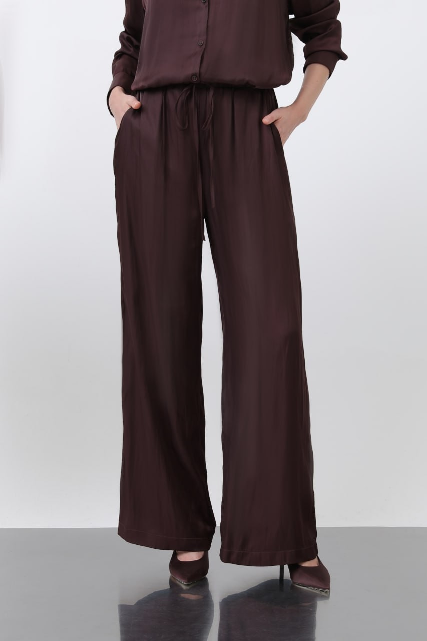 İpeksi dokusuyla lüks bir his uyandıran saten pantolon, belden bağlamalı detayıyla zarif bir siluet sunuyor. Şık ve akışkan yapısıyla hem günlük hem de özel kombinlerde rahatlıkla tercih edilebilecek bir parça.