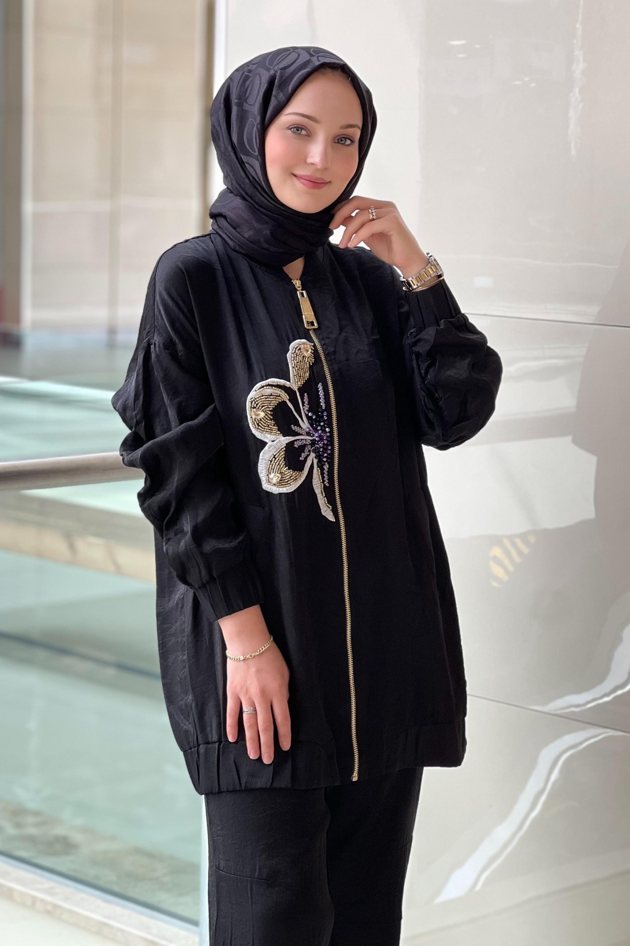 Kap Sıfır Yaka Düşük Kol Kolu Büzgülü Fermuarlı Cepli