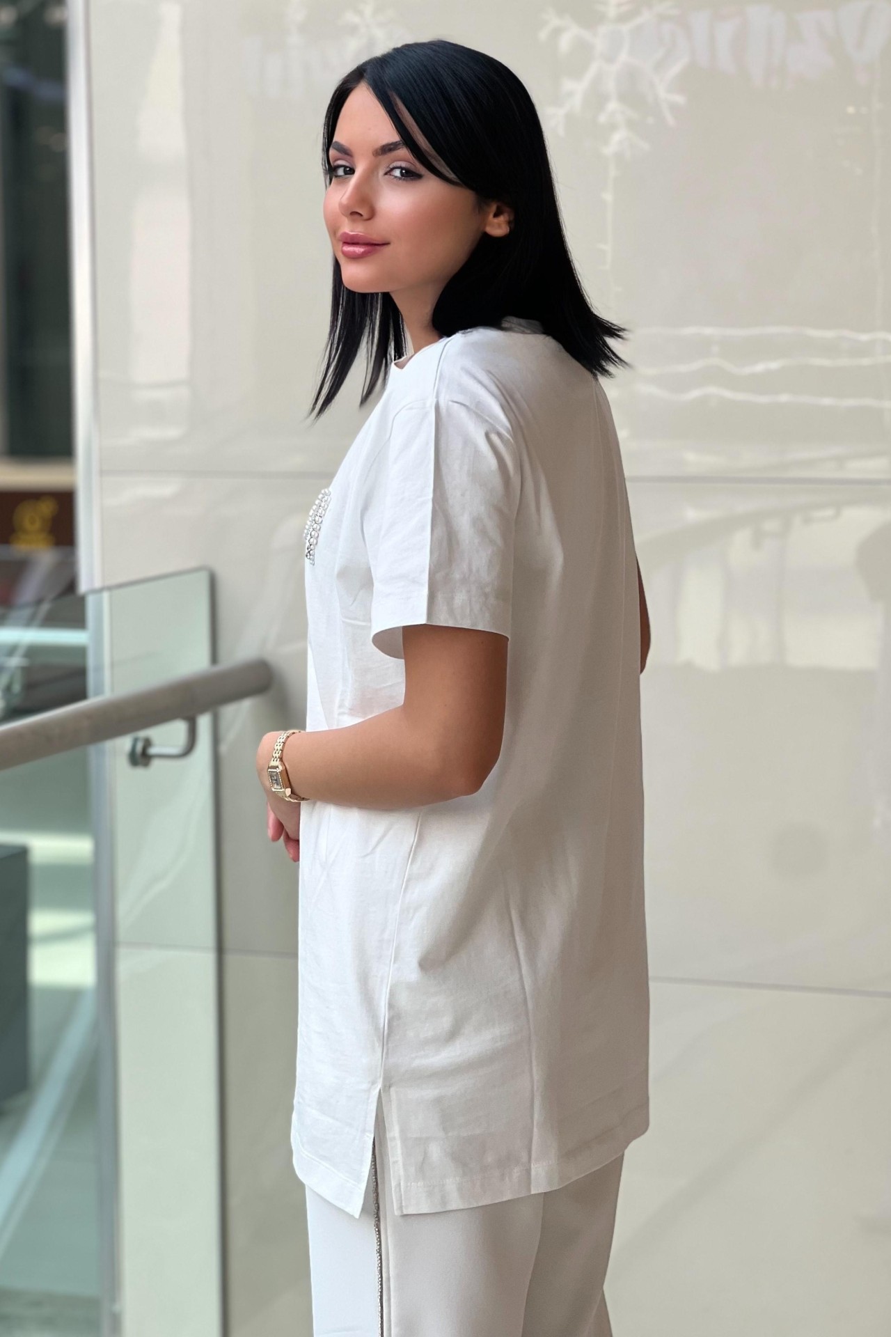 Sıfır Yaka Kısa Kollu Logo Taş / İnci İşlemeli