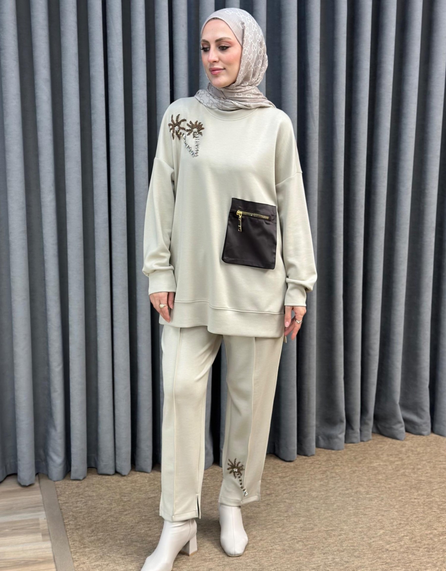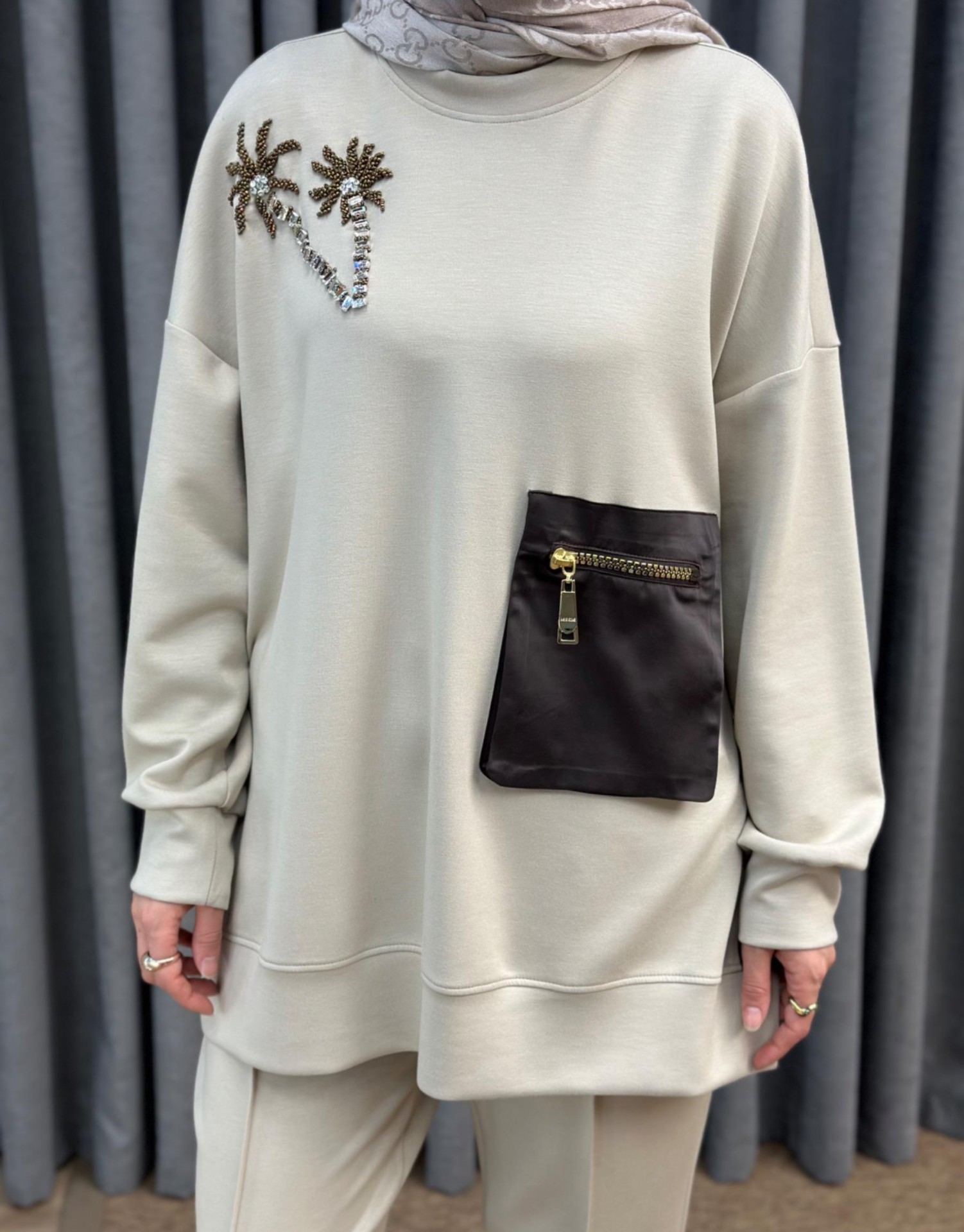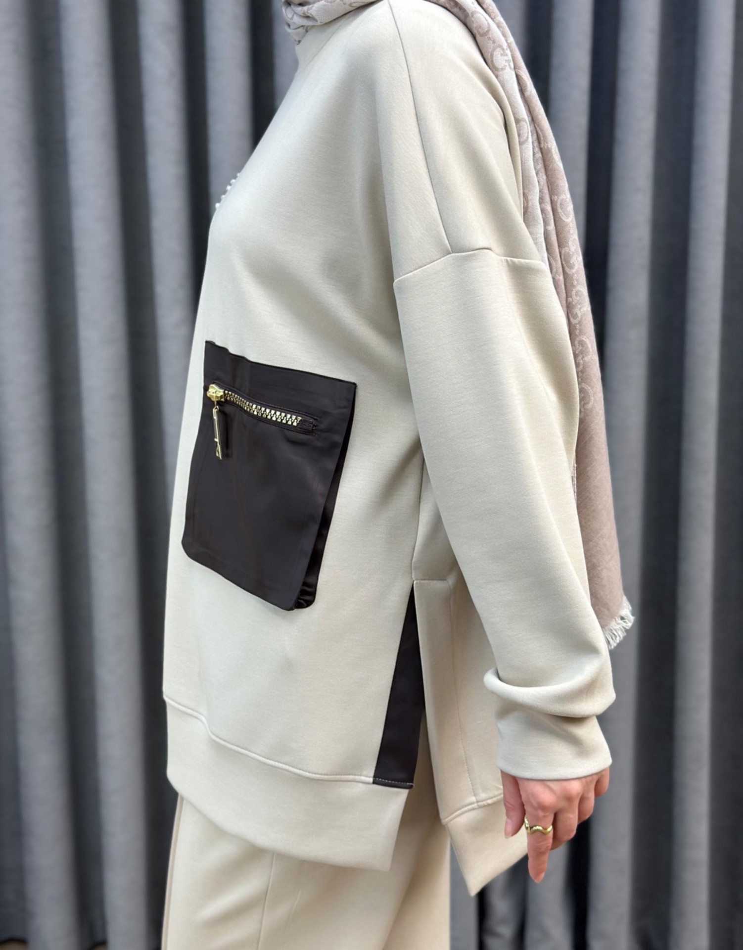 Kap Sıfır Yaka Düşük Kol Kolu Büzgülü Fermuarlı Cepli