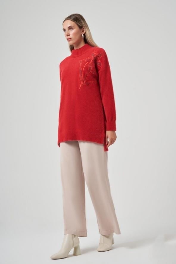 Nuss 7004 Sıfır Yaka Çiçek Nakış İşlemeli Angora Tunik