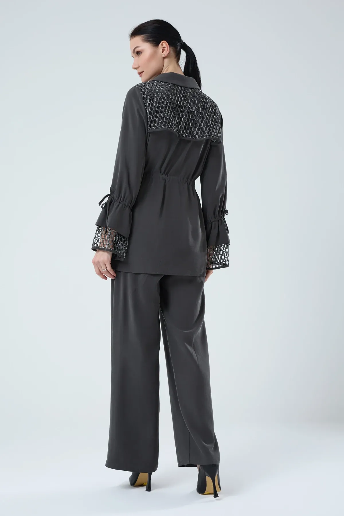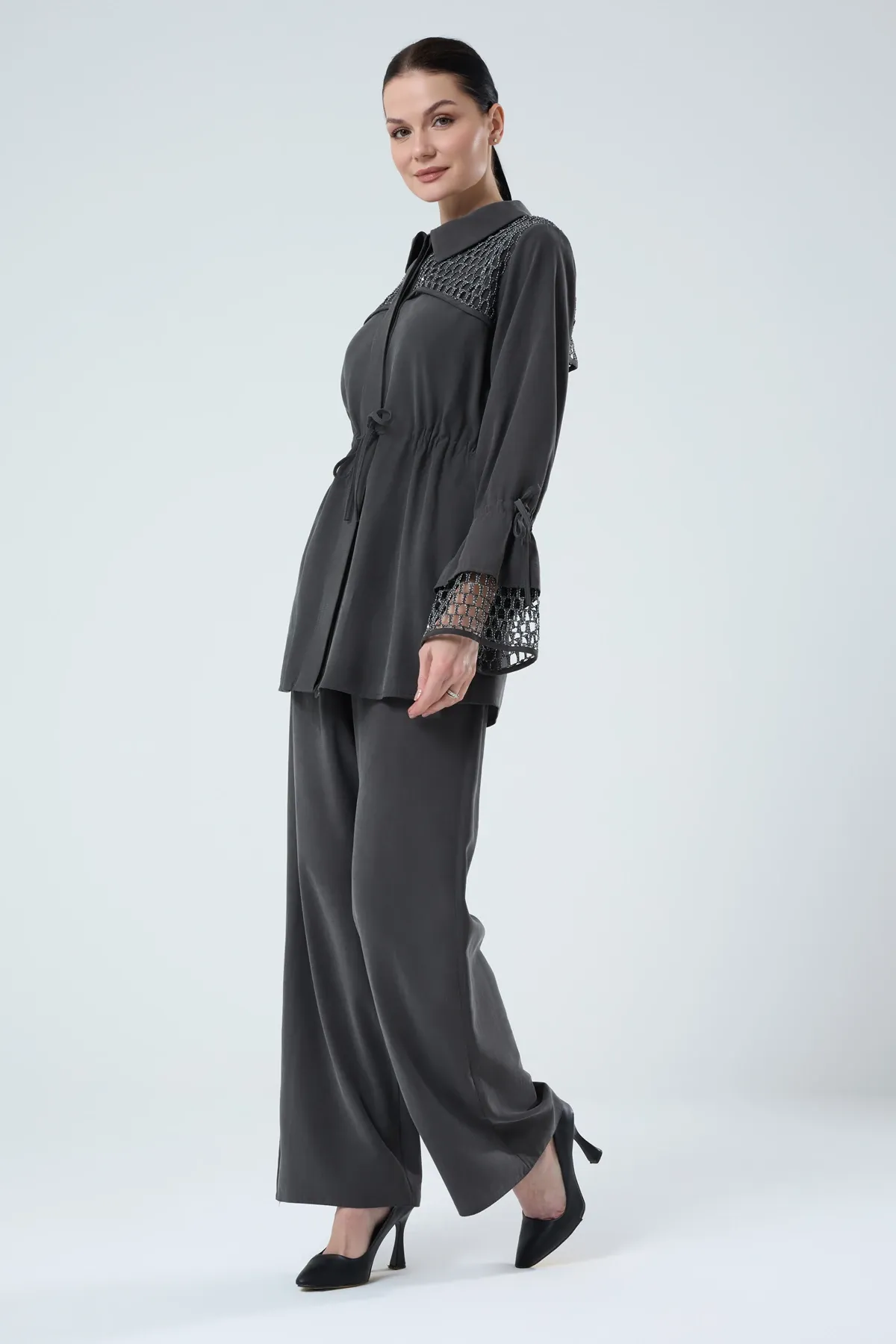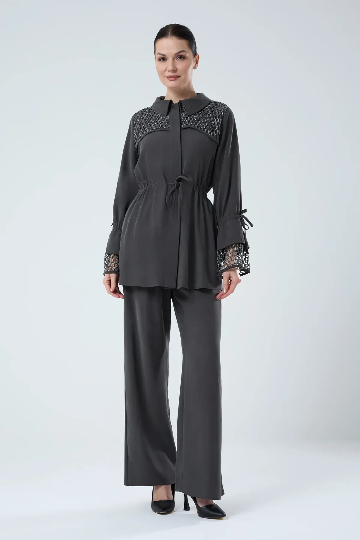 Modern tasarım anlayışı ve şık detaylarıyla öne çıkan Kadın Modern File Detaylı İki Parça Takım, konforlu şıklığı bir arada sunar.