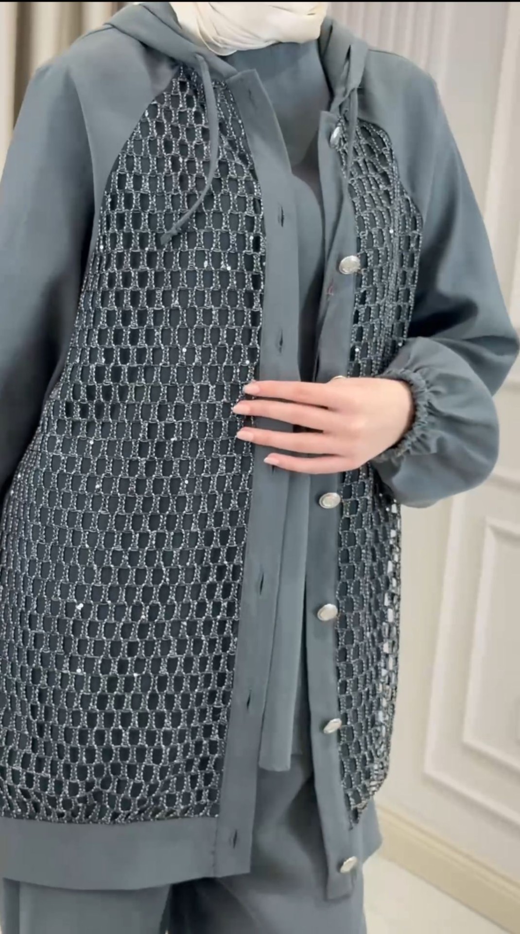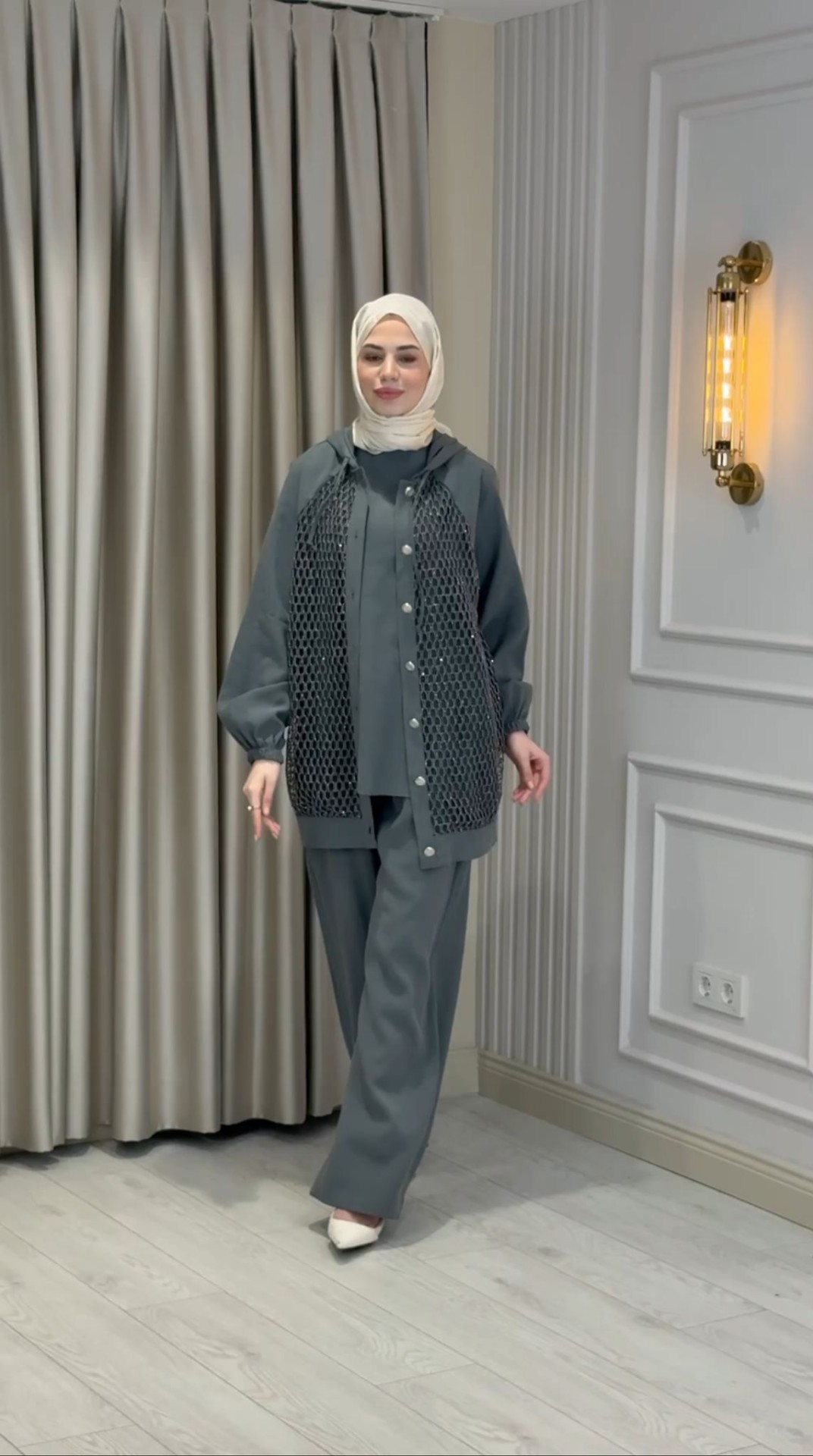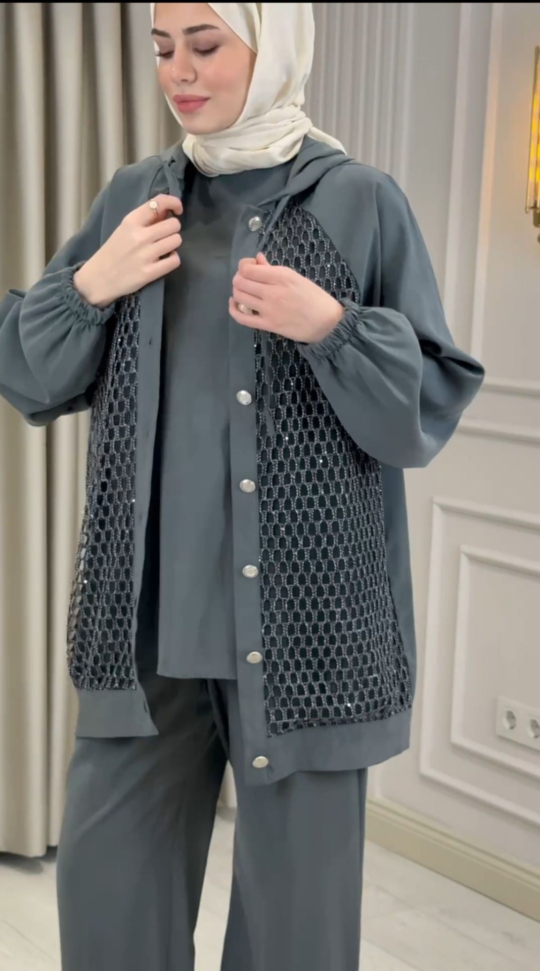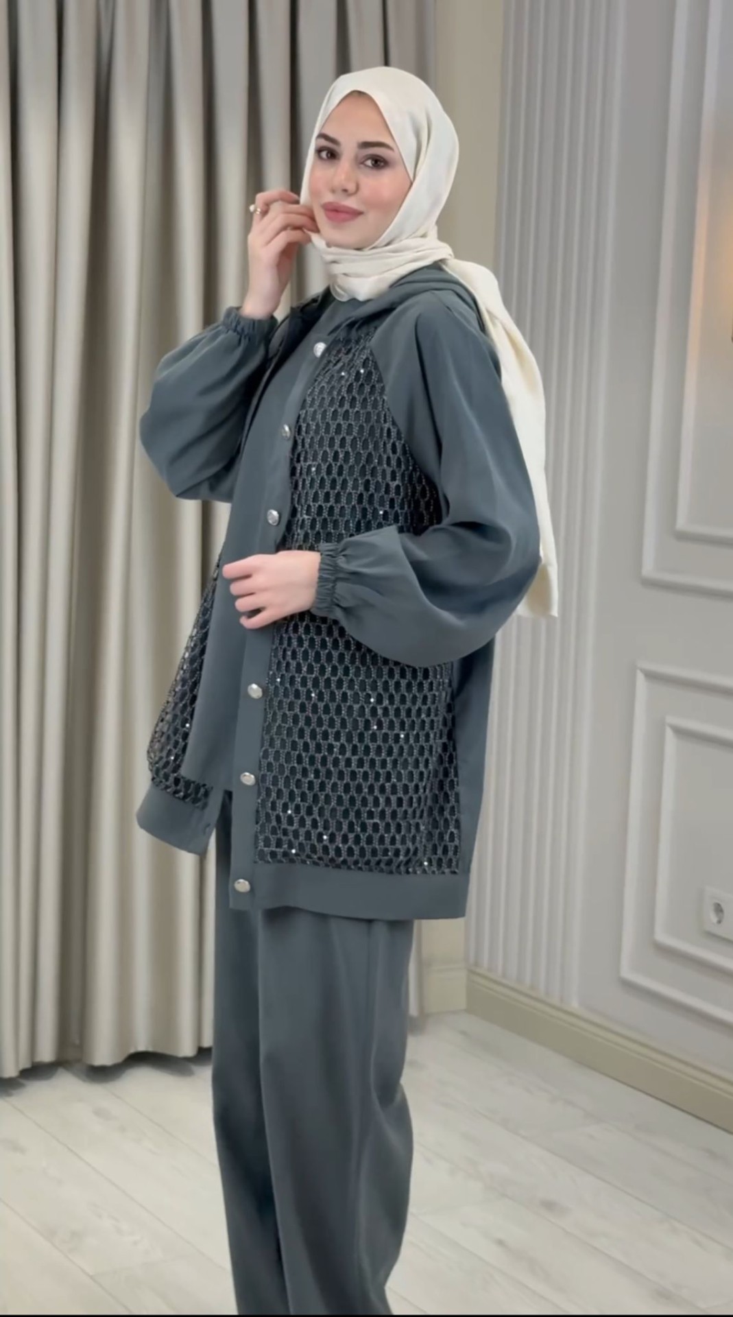 Modern tasarım anlayışı ve şık detaylarıyla öne çıkan Kadın Modern File Detaylı İki Parça Takım, konforlu şıklığı bir arada sunar.