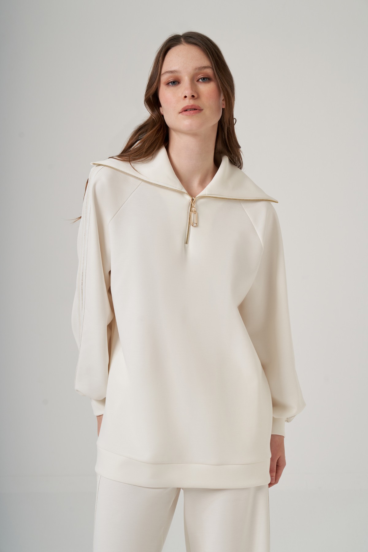 Tunik Dik Yaka Fermuarlı Reglan Kol Rahat Kalıp