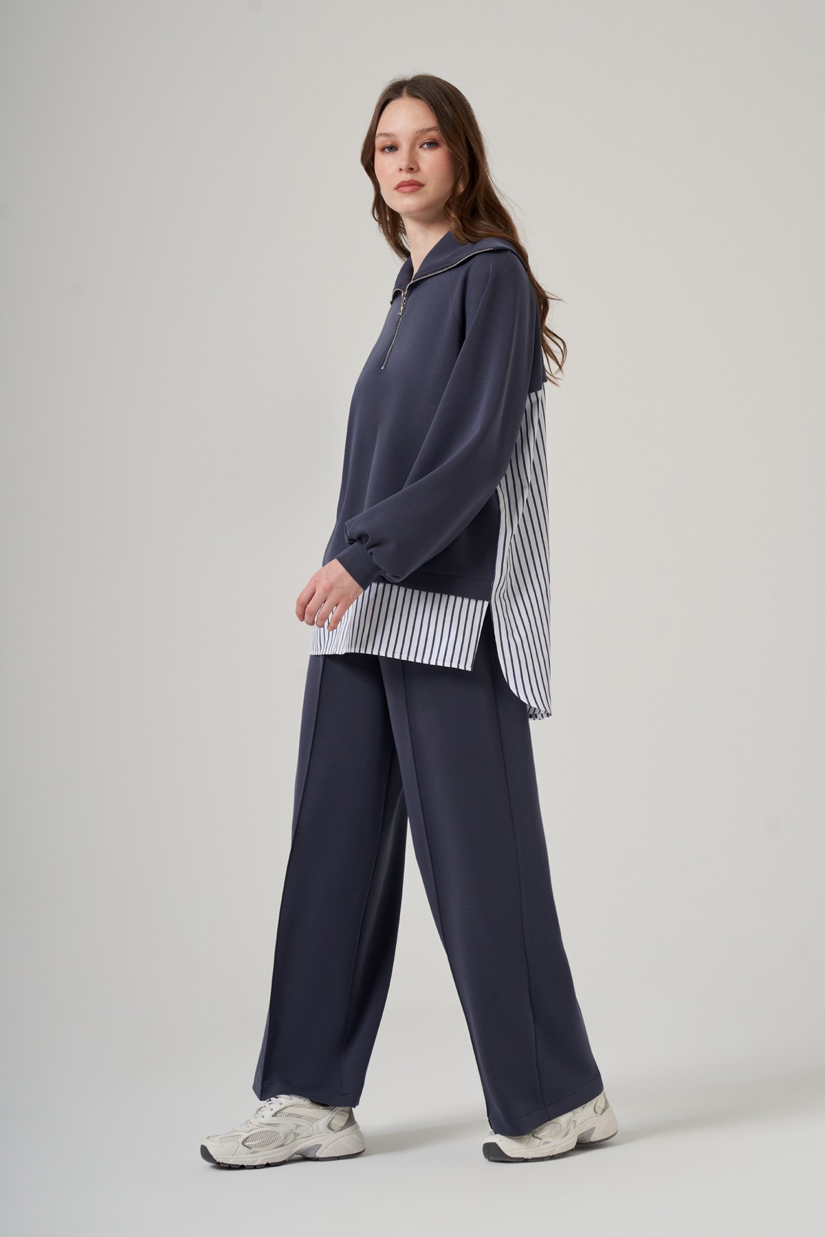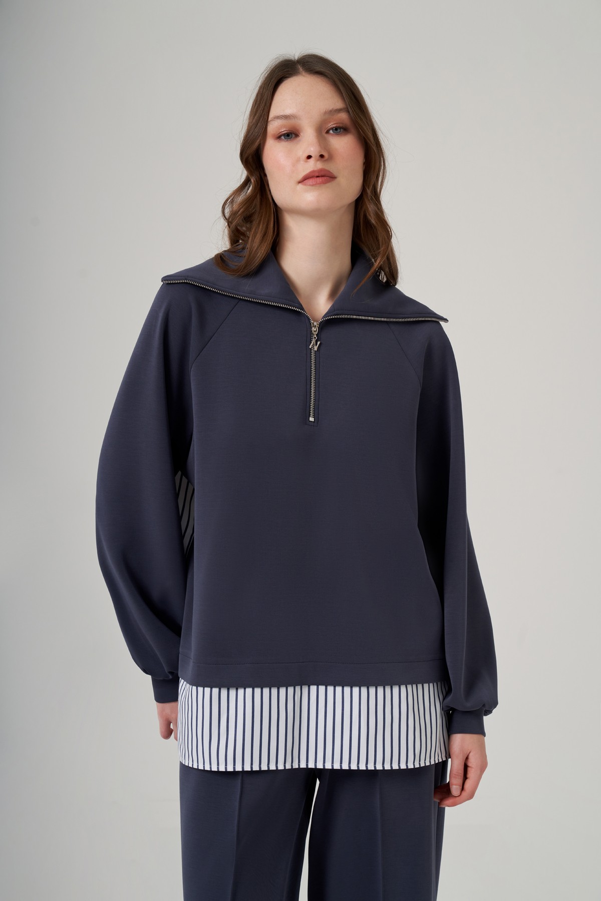Tunik Dik Yaka Fermuarlı Reglan Kol Rahat Kalıp
