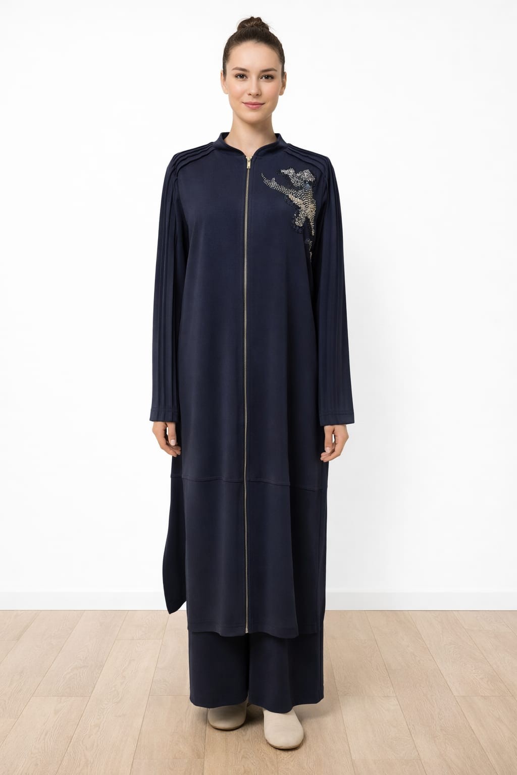 Nurcan Çetin 26448 Boncuk İşli Nervürlü Fermuarlı Uzun Kap Pantolon Takım