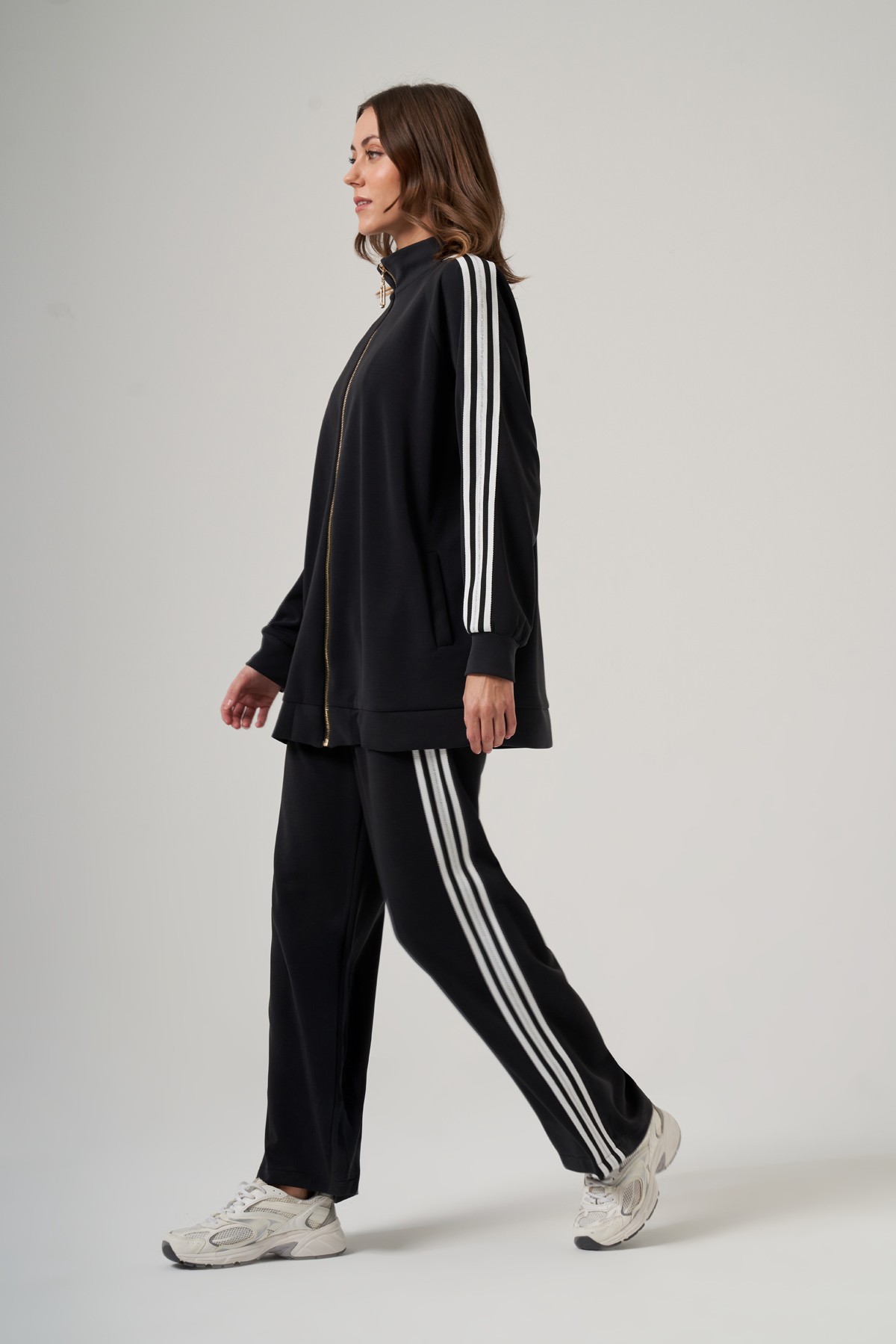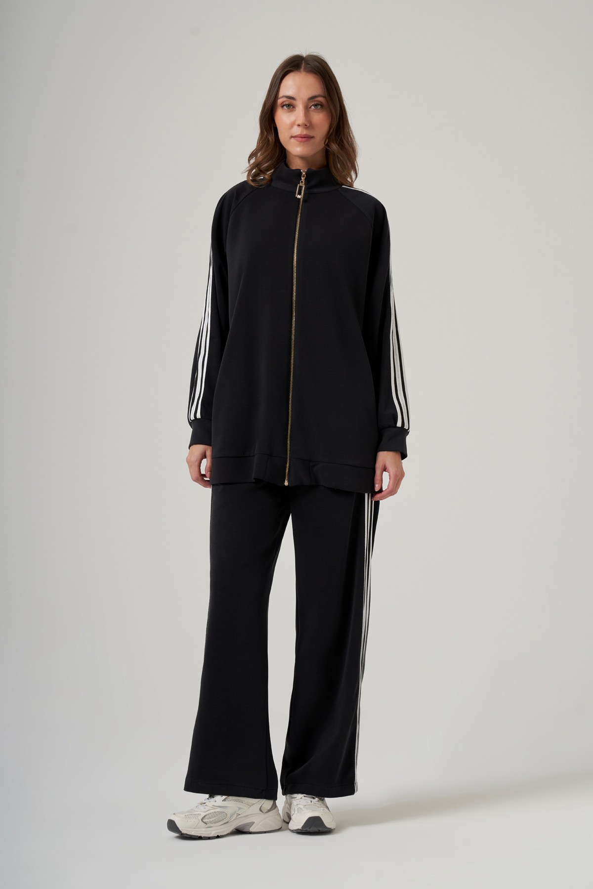 Tunik Dik Yaka Fermuarlı Reglan Kol Rahat Kalıp