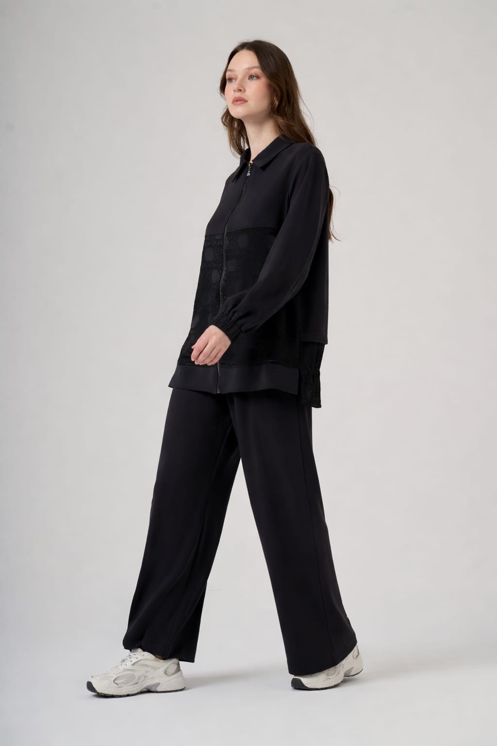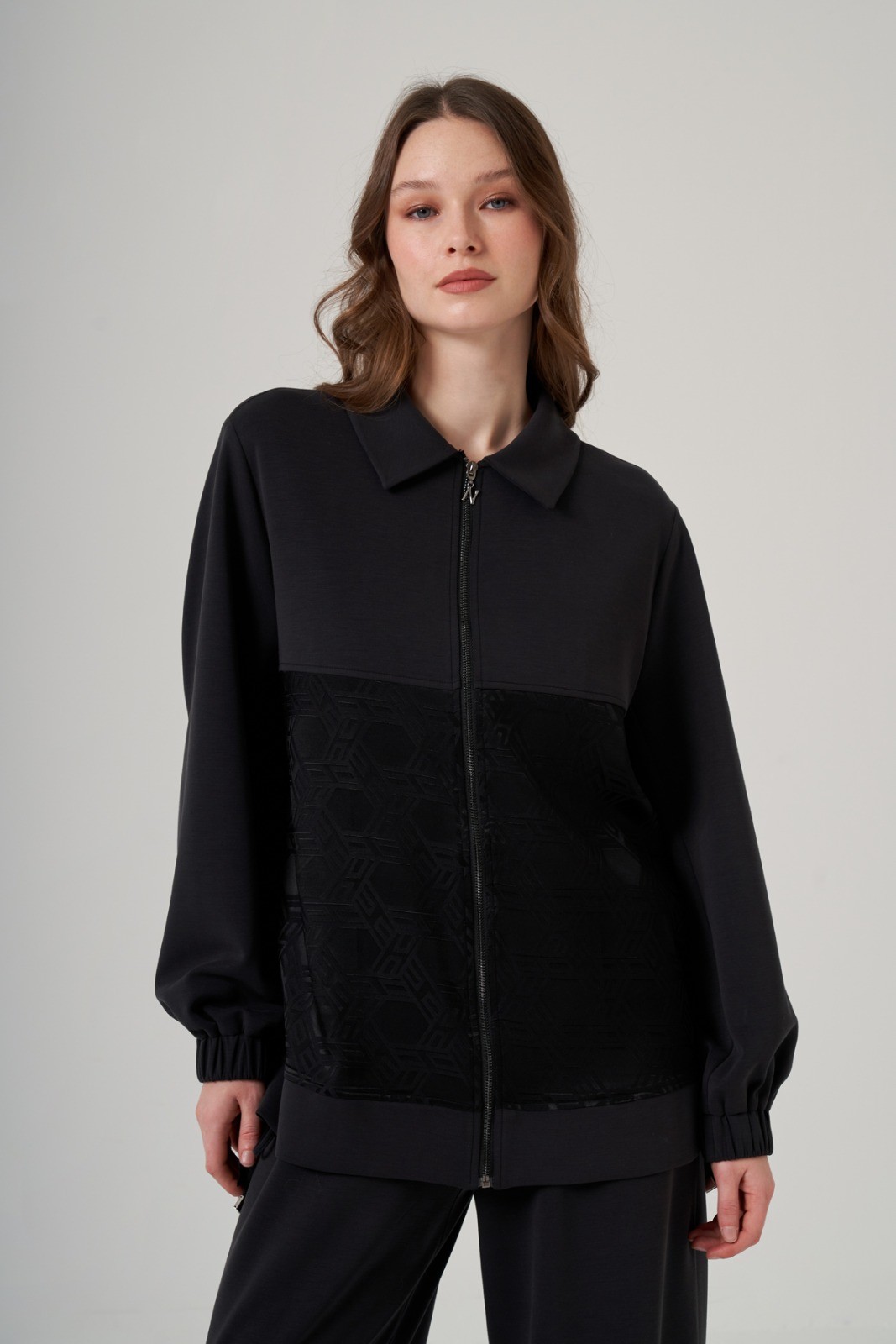 Kap Dik Yaka Düşük Kol Önden Fermuarlı Rahat Kalıp