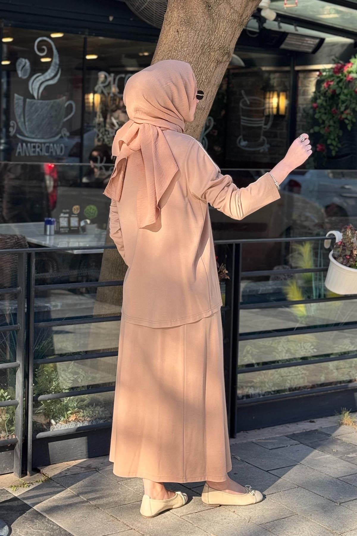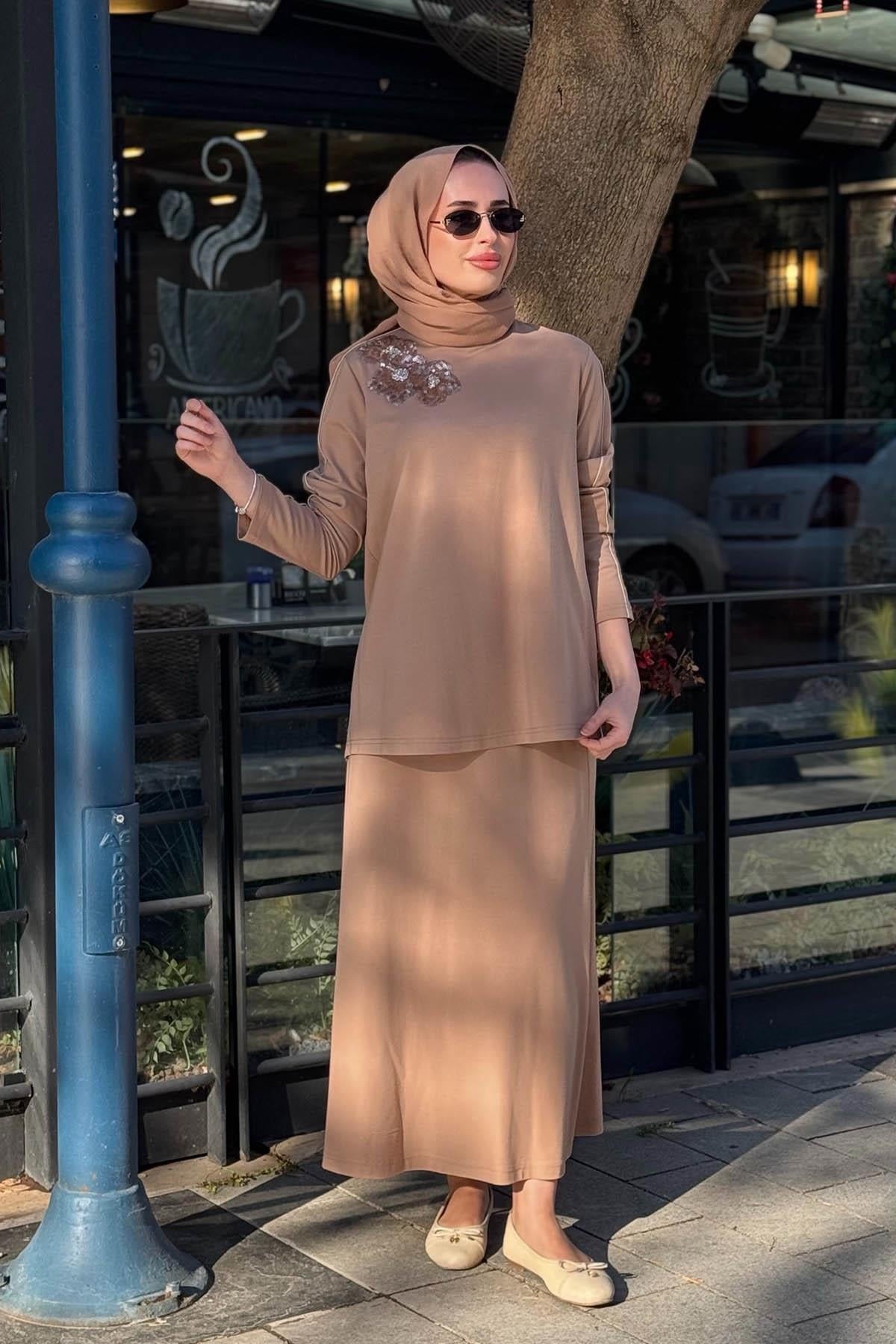 Nurcan Çetin 26441 Omuzu Pul Payet İşlemeli Biye Detaylı Tunik Etek Takım